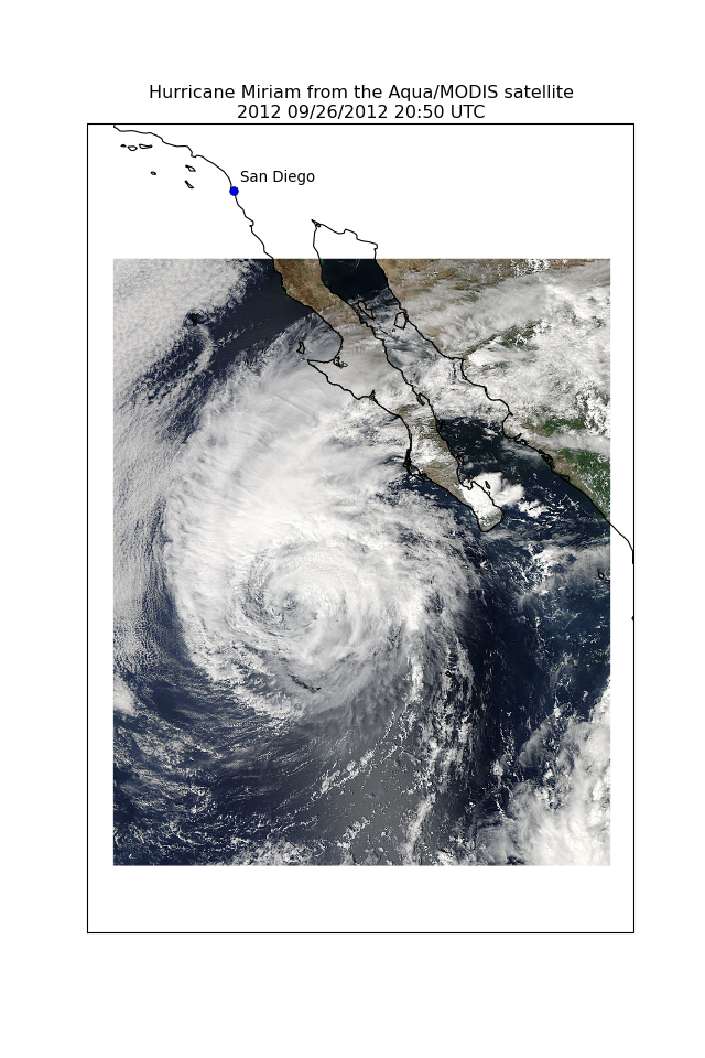 plt.title('Hurricane Miriam from the Aqua/MODIS satellite\n'