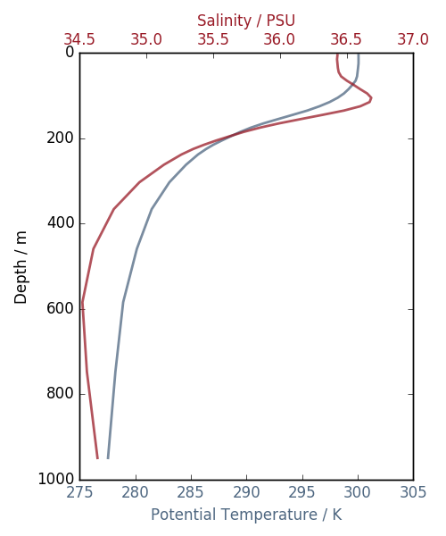 ax2.set_xlabel('Salinity / PSU', color=salinity_color)