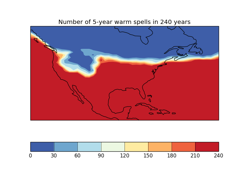 In this case, we have a 240-year sequence of yearly average surface temperature over North America, and we want to calculate in how many years these exceed a certain temperature over a spell of 5 years or more.