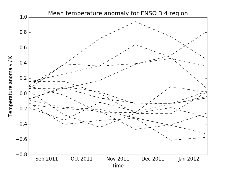 - The second plot shows the data limited to a region of interest, in this case a region defined for forecasting ENSO (El Nino-Southern Oscillation), which, for the purposes of this example, has had the ensemble mean subtracted from each ensemble member to give an anomaly surface temperature. In practice a better approach would be to take the climatological mean, calibrated to the model, from each ensemble member.